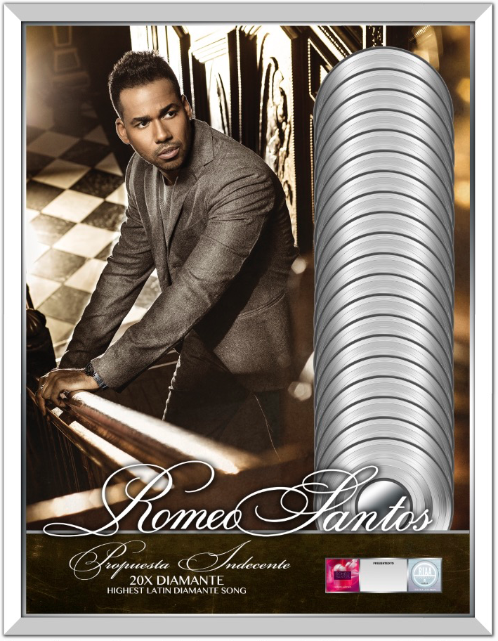La superestrella mundial ROMEO SANTOS recibe disco Multi-Diamante de la RIAA por “PROPUESTA INDECENTE” El sencillo Diamante con más certificaciones en la historia del Oro y Platino